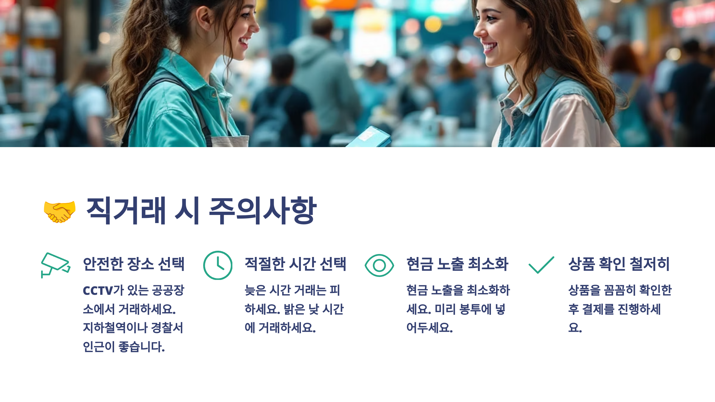 직거래는 안전하지만 그만큼 주의해야 할 점들도 많아요. 충분한 준비와 신중한 판단으로 안전하게 거래하세요! 상황이 조금이라도 이상하다고 느끼면 주저하지 말고 거래를 중단하는 용기도 필요해요 ✨